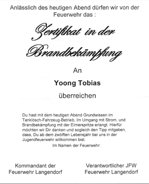 On this occasion, with the permission of the Fire Department, we present Yoong Tobias with a Certificate in Fire-fighting. You have gained basic knowledge in fire-fighting vehicle operation, in handling electricity on the street, and with bucket/pistol fire-fighting. We thank you and would like you to know that you are welcomed to join the Youth Fire Brigade when you are 12 years old.
