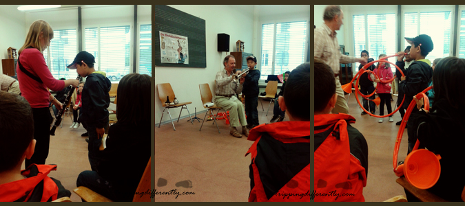 Here are the brass/wind instruments – Left: trying out the clarinet. Middle: blowing the trumpet. Right: the teacher had them try to make a sound with an instrument constructed out of PVC pipe and a funnel. It was hilarious! This was to show them how the wind moves through the instrument to create a sound/note.