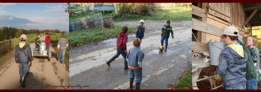 When we got back to the farm, everyone was home already. The boys along with the 2 younger farmer’s boys gathered the water and pellets for the sheep, which were in the field a little way down the hill. Then the boys played some soccer on the street. After which, they went to feed the calves with milk from the evening’s milking. Those calves were hungry little things!