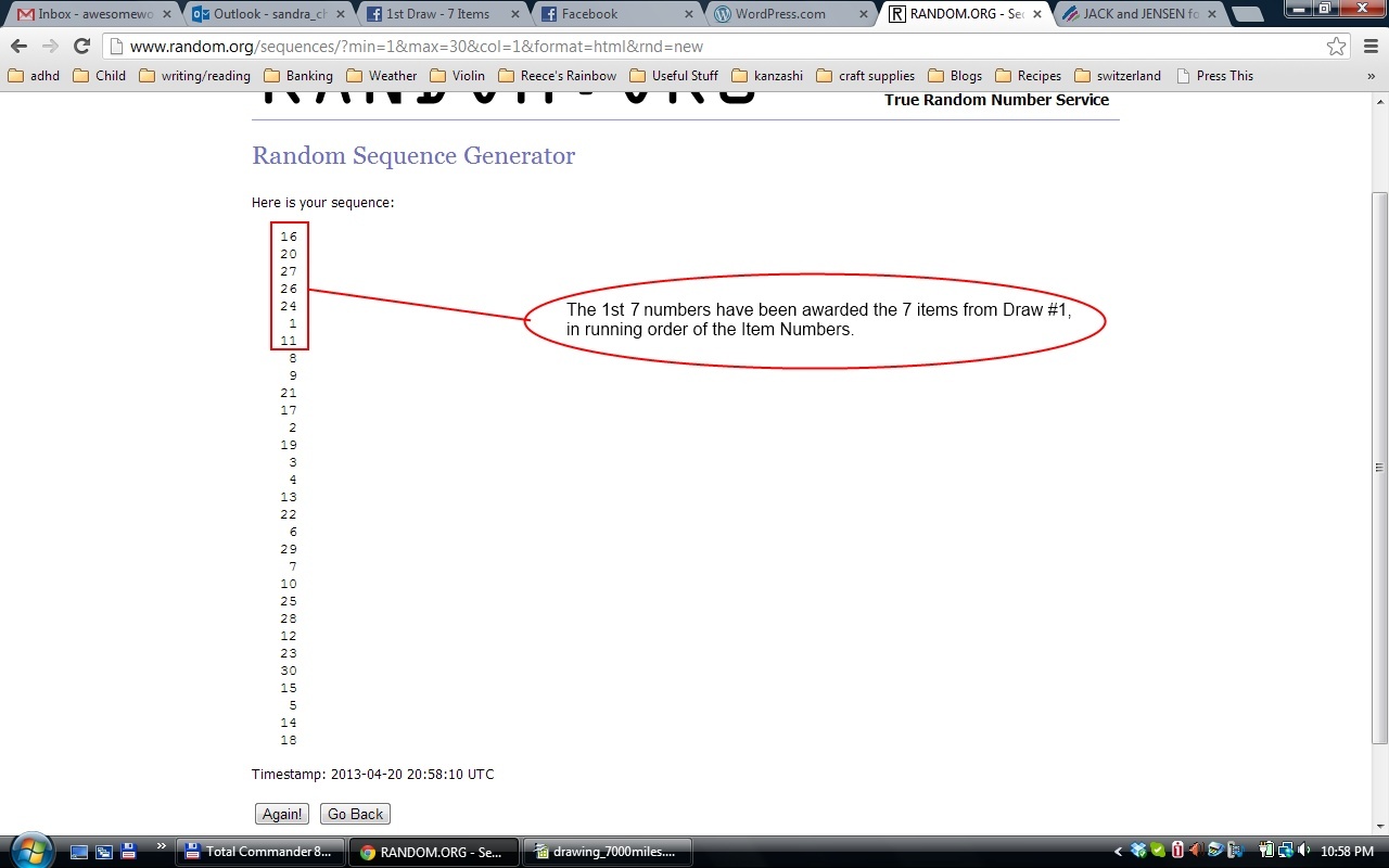 We used Random.org to generate a random sequence of numbers (1-30, as we had 30 spots given out, both contribution spots and “share” spots), then took the first 7 numbers as the chosen recipients.