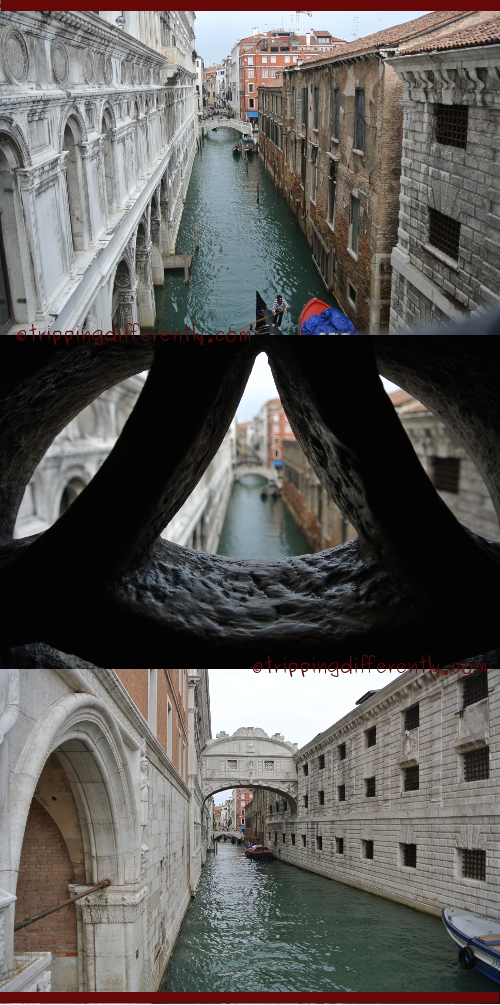 This is the view from the Bridge of Sighs – it was a prisoner’s last view of the outside world. The bottom picture (in the above collage) is taken from the outside, looking at the Bridge of Sighs.