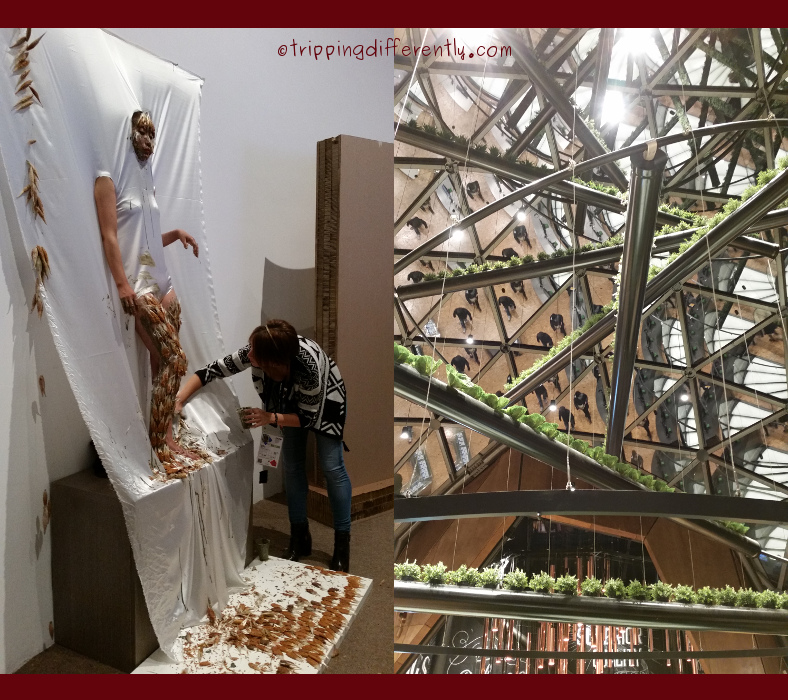 We knew there were a few pavilions we wanted to see, so with limited time, we headed for those only. We walked in and had a quick look around at a performance art exhibition by 5 artists from a certain school – the name escapes me now, but you can see one of them working in the picture above on the left. On the right is a picture of the hydroponics system in the Belgium (i think) pavilion, which we found very interesting and was probably the most on-topic pavilion we saw.