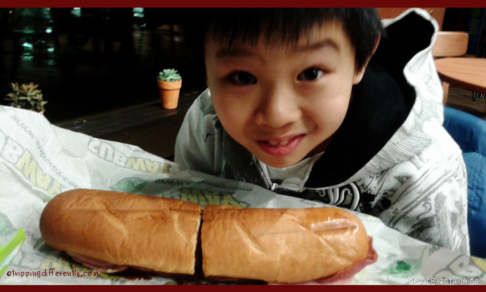 Camera 360Some time in February, Tobias decided that he would attempt to finish an entire Subway Foot-long Sandwich (a whole 30 centimeters of bread and fillings). He has tried a few times since but has not been successful. It doesn’t matter whether he did or did not finish that huge sandwich; what was important is that he tried and it was fun watching him try 😉