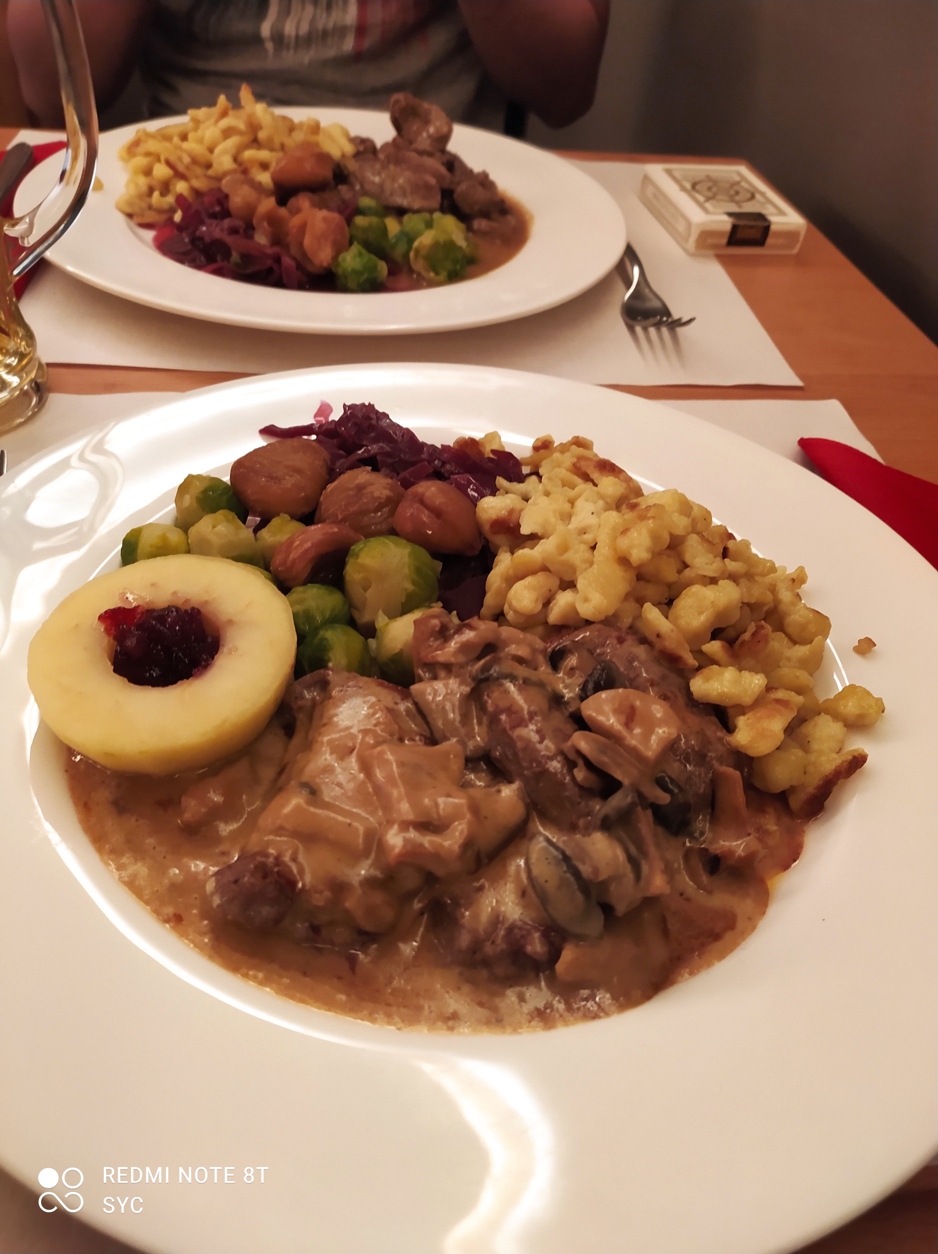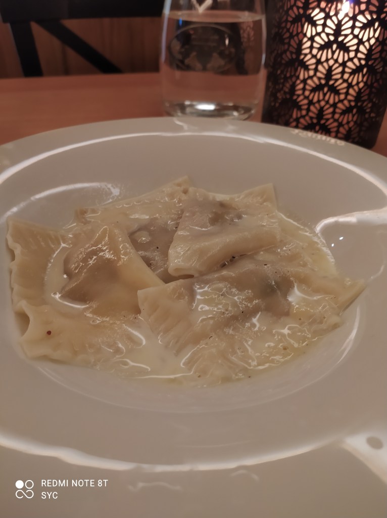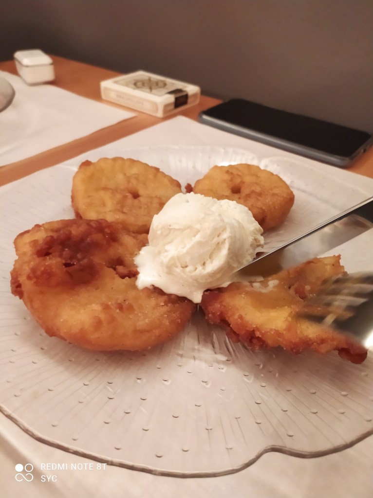 Can you see our wrinkles?The Husband’s and The Son’s mealsRavioli filled with figs in a honey cream sauceOne of my favourite desserts – Vermicelli, it’s made with chestnutsDeep fried applesAnniversary Present – a nod to our themed wedding